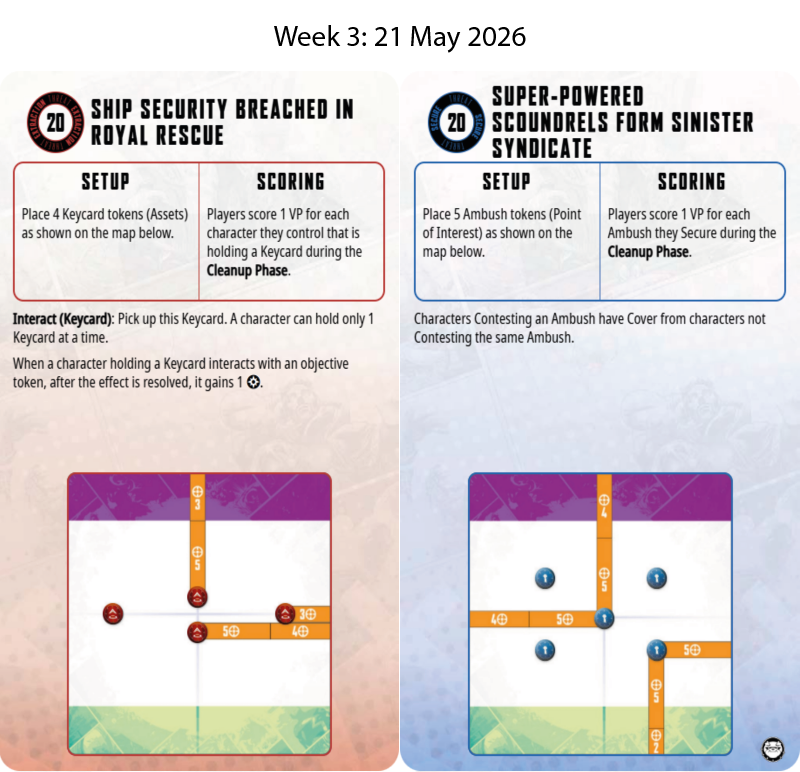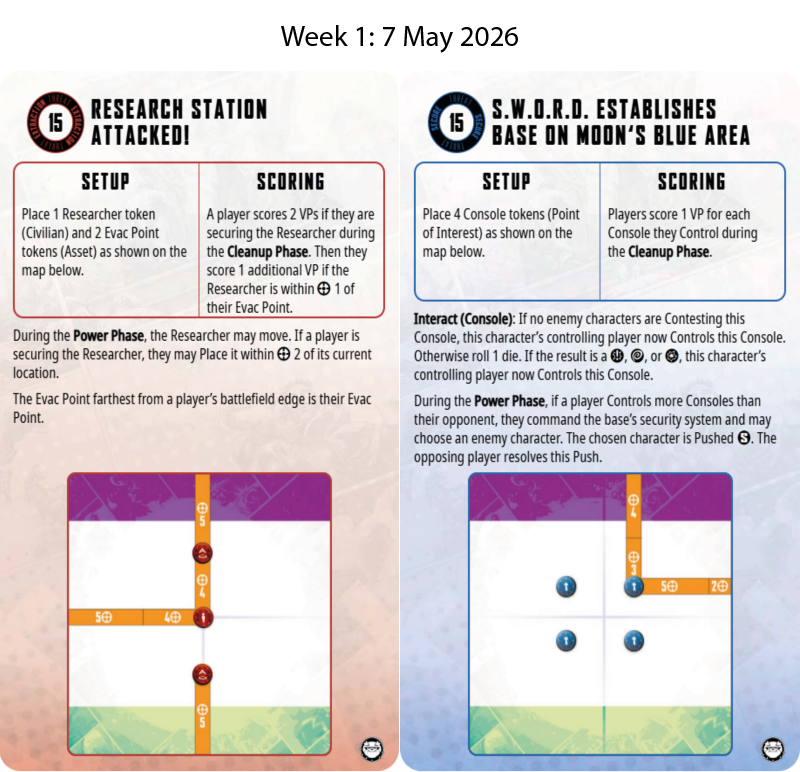 - 28th May: Escalation Campaign Week 2 - Tournament rules in effect. Bring a squad of 10 characters, 10 tactic cards, 5 extraction cards and 5 secure cards. Following Game Setup choose either a secure or extraction card and then select your squad accordingly and 5 tactic cards. (6:30pm start). See the Missions being played here.