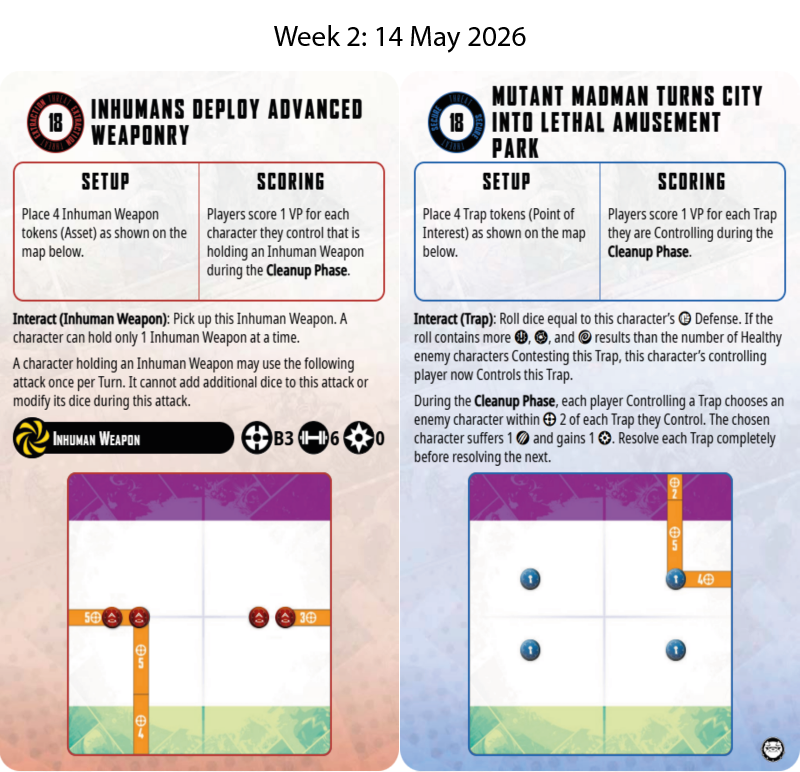 - 21st May: Escalation Campaign Week 1 - Bring a Marvel Crises Protocol team with 18 Crisis points and 3-6 characters and select 3 tactic cards. You can use Affiliations and the leadership ability of one of the characters. (6:30pm start). See the Missions being played here.